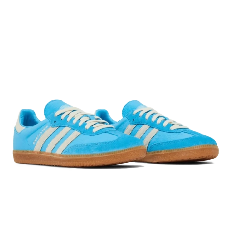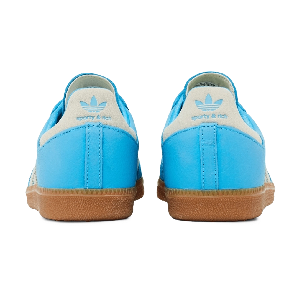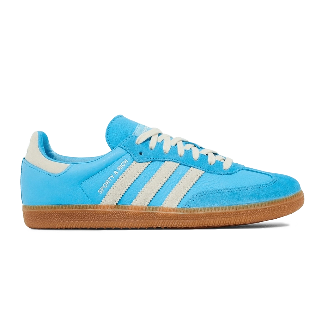 נעלי Sporty & Rich x Samba OG בצבע בלו ראש עם פרטים בקרם וויט מציעות גרסה צבעונית ומרעננת לסילואט הקלאסי של סמבה. עליונית עור איכותית בצבע בלו ראש משולבת בפרטים בצבע קרם וויט וסוליית גומי עמידה, ליצירת שילוב מושלם של סגנון ופונקציונליות. הנעל נוחה ללבישה יומיומית ומביאה את עיצוב הרחוב הקלאסי עם טאצ’ מודרני וצבעוני.