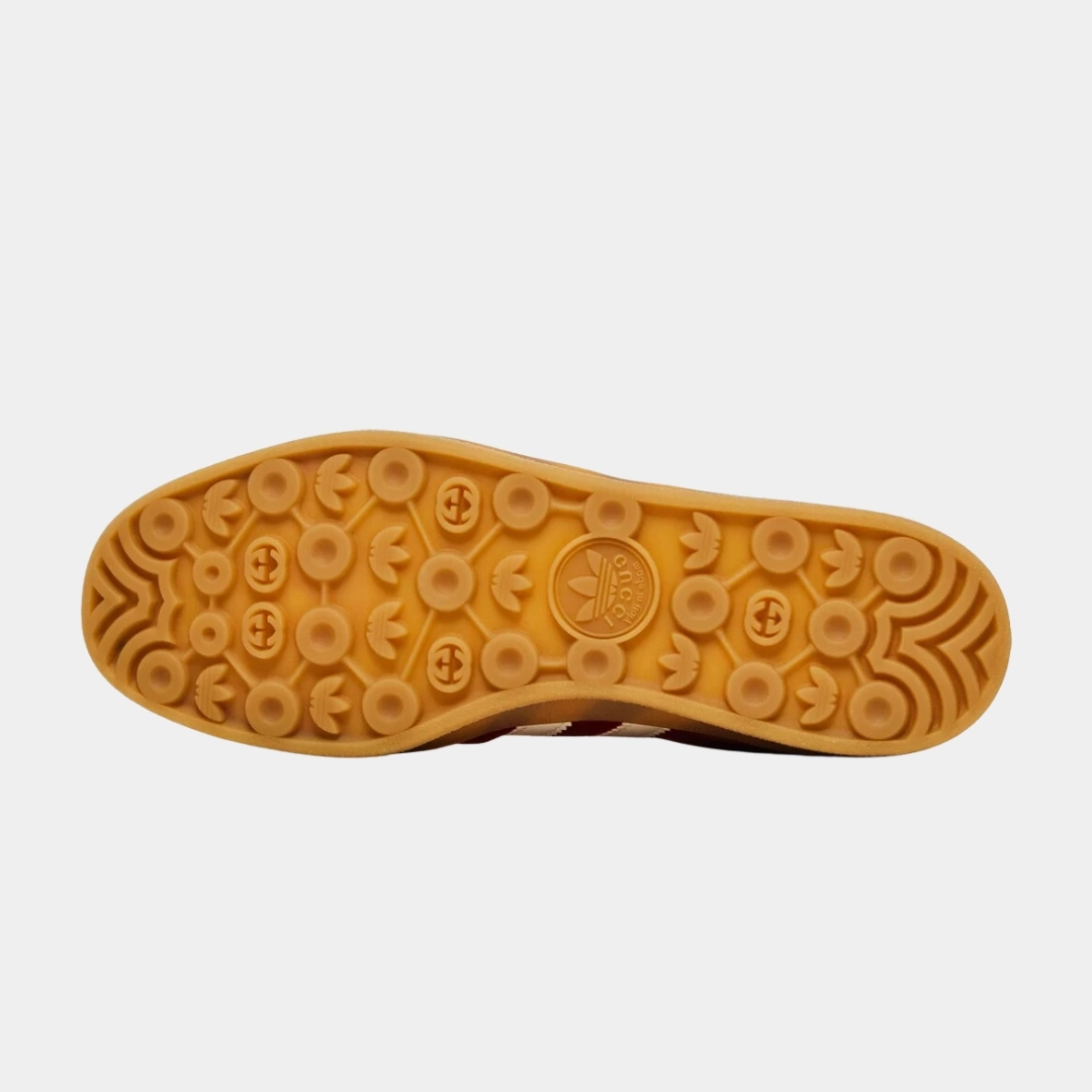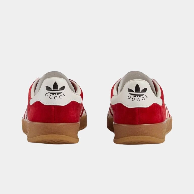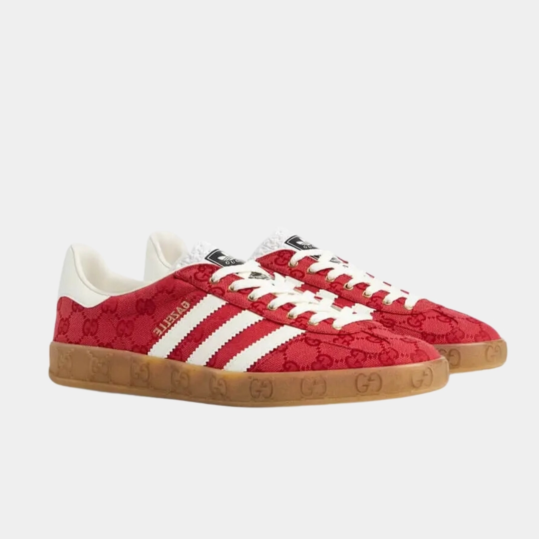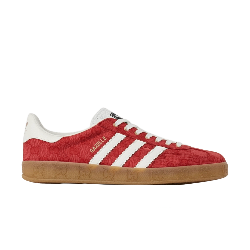 ה־adidas x Gucci Gazelle Red GG Monogram משלב את הסילואט הקלאסי של גאזל עם הטאץ’ היוקרתי של גוצ’י. הנעל עשויה קנבס אדום עם מונוגרם GG ייחודי, בשילוב פרטי עור איכותיים וסוליית גומי בסגנון וינטג’. עיצוב זה מגלם את המפגש בין אופנת ספורט לאלגנטיות גבוהה ומתאים גם ללוק יום־יומי וגם למראה מוקפד.