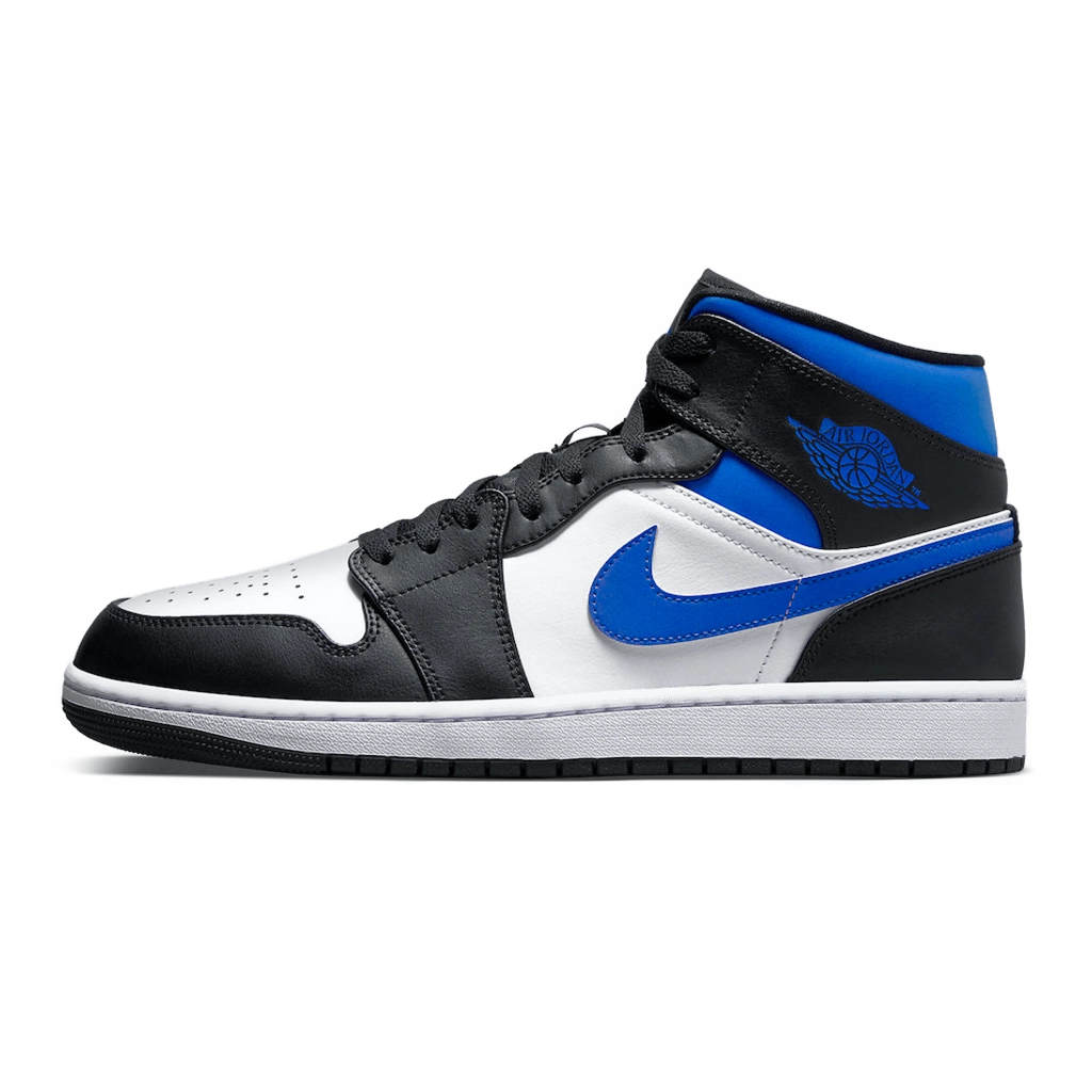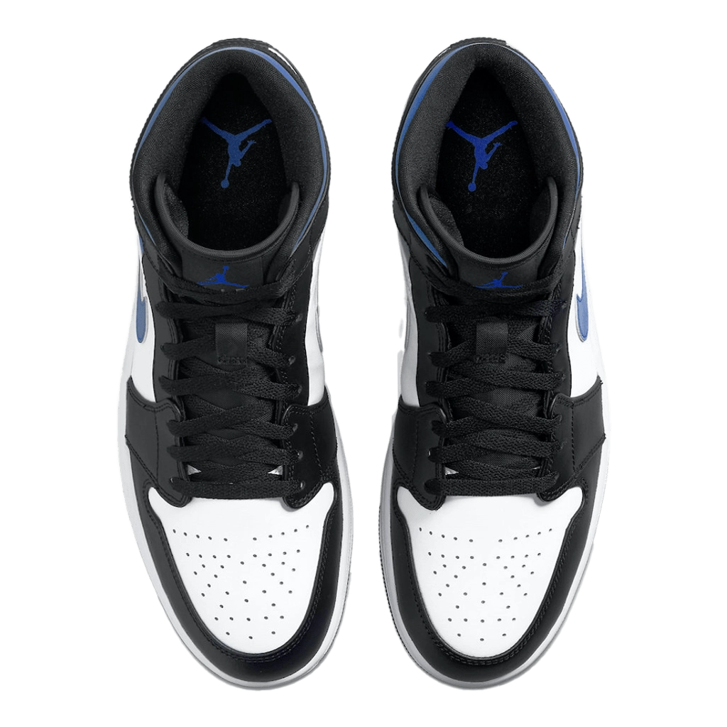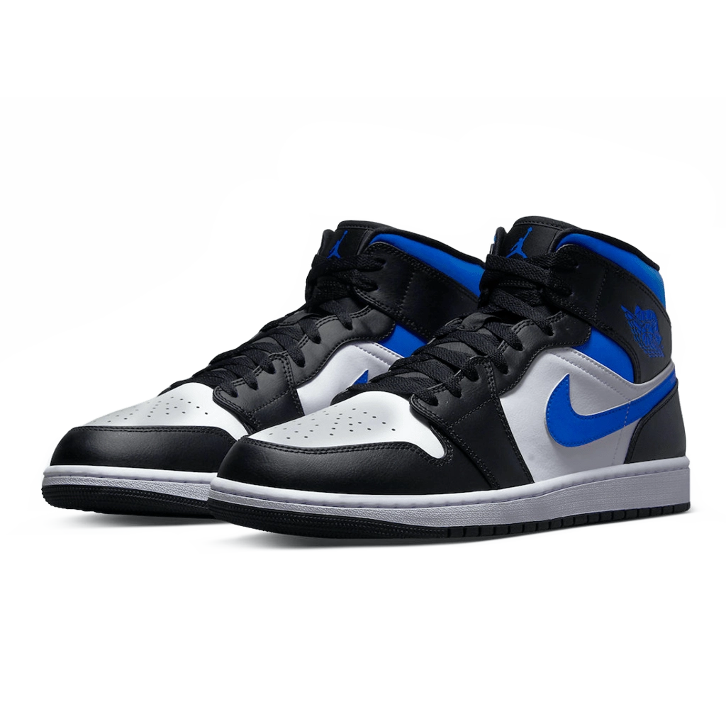 נעלי Air Jordan 1 Mid Racer Blue משלבות שכבות כחולות עם עור לבן קלאסי. סניקרס נצחי לסטייל יומיומי.