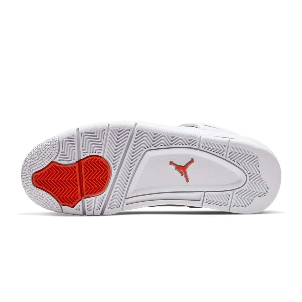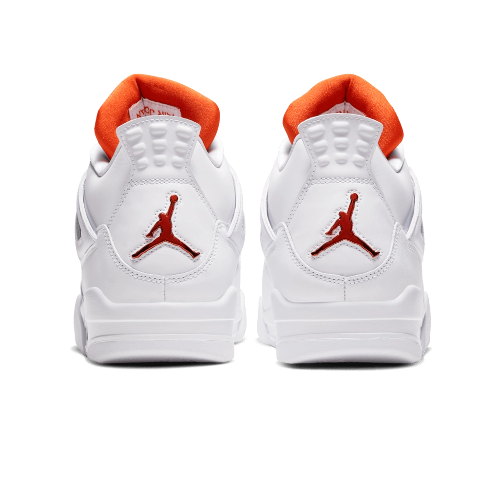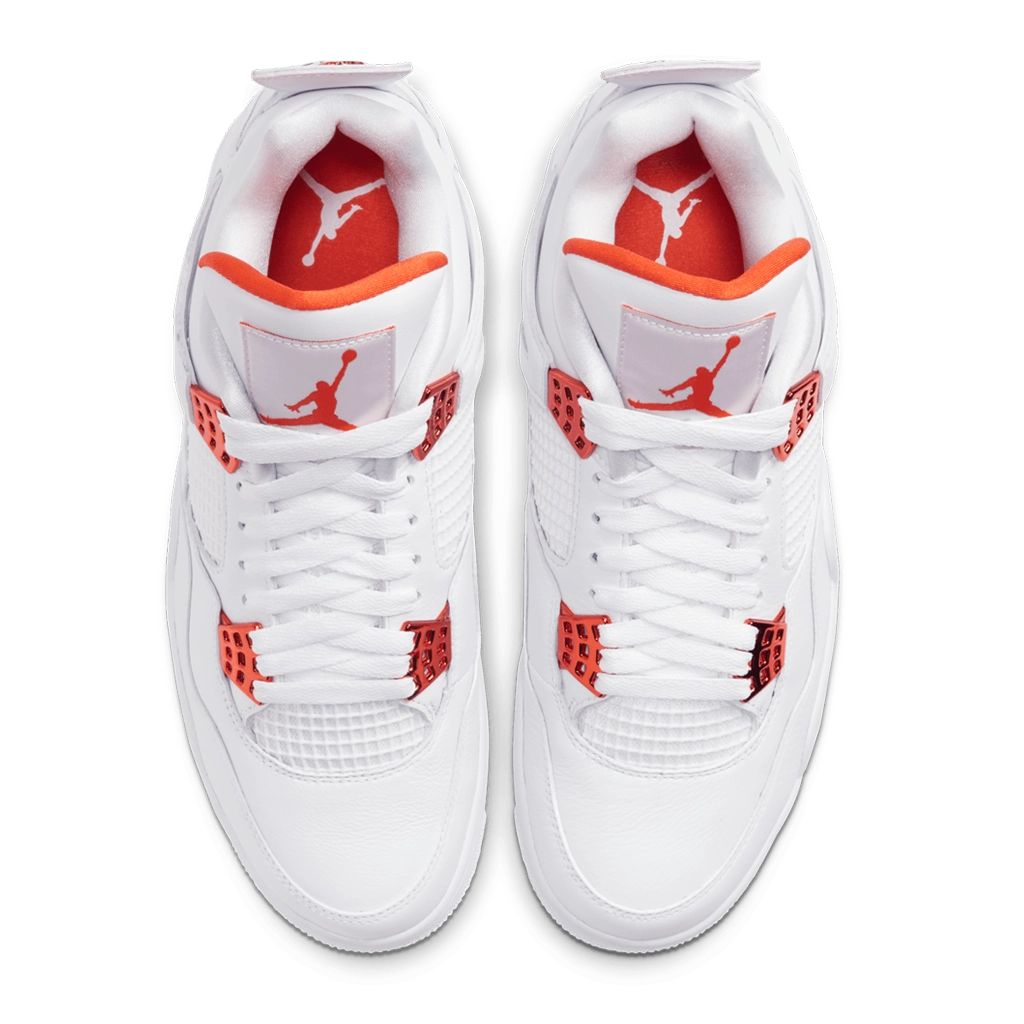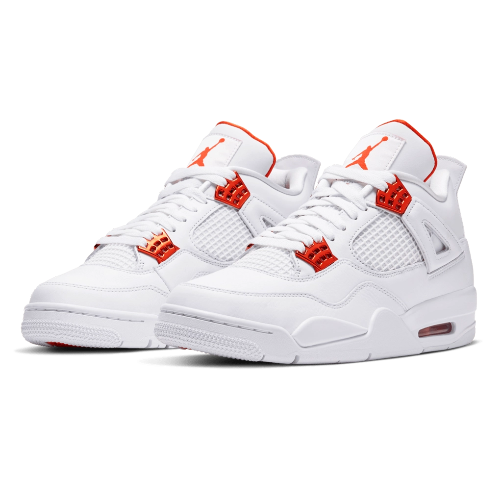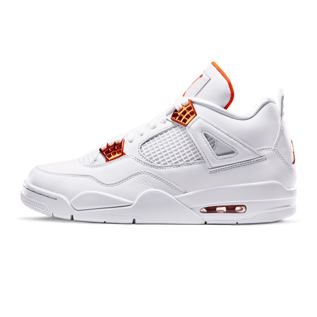 האייר ג’ורדן 4 “Orange Metallic” משלב סילואט עור לבן מלא עם נגיעות כתום מטאלי עזות – טוויסט מודרני על עיצוב קלאסי.
