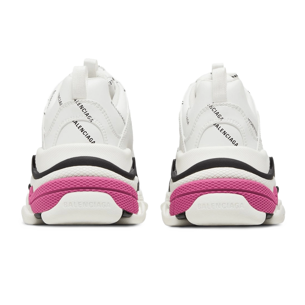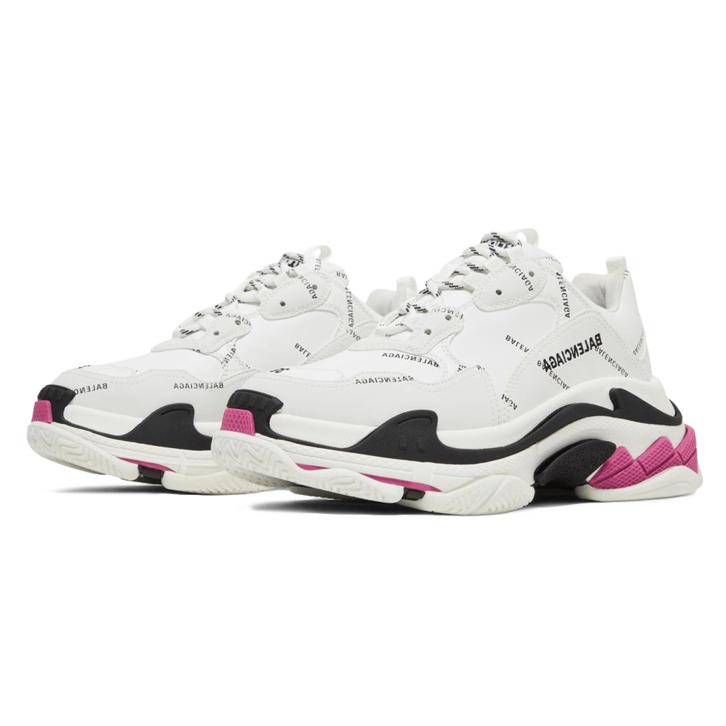 Balenciaga Triple S Allover Logo White Pink משלב עיצוב עבה עם גווני לבן ורוד שובבים. נועז, מסוגנן ומושלם לאופנת רחוב מודרנית.