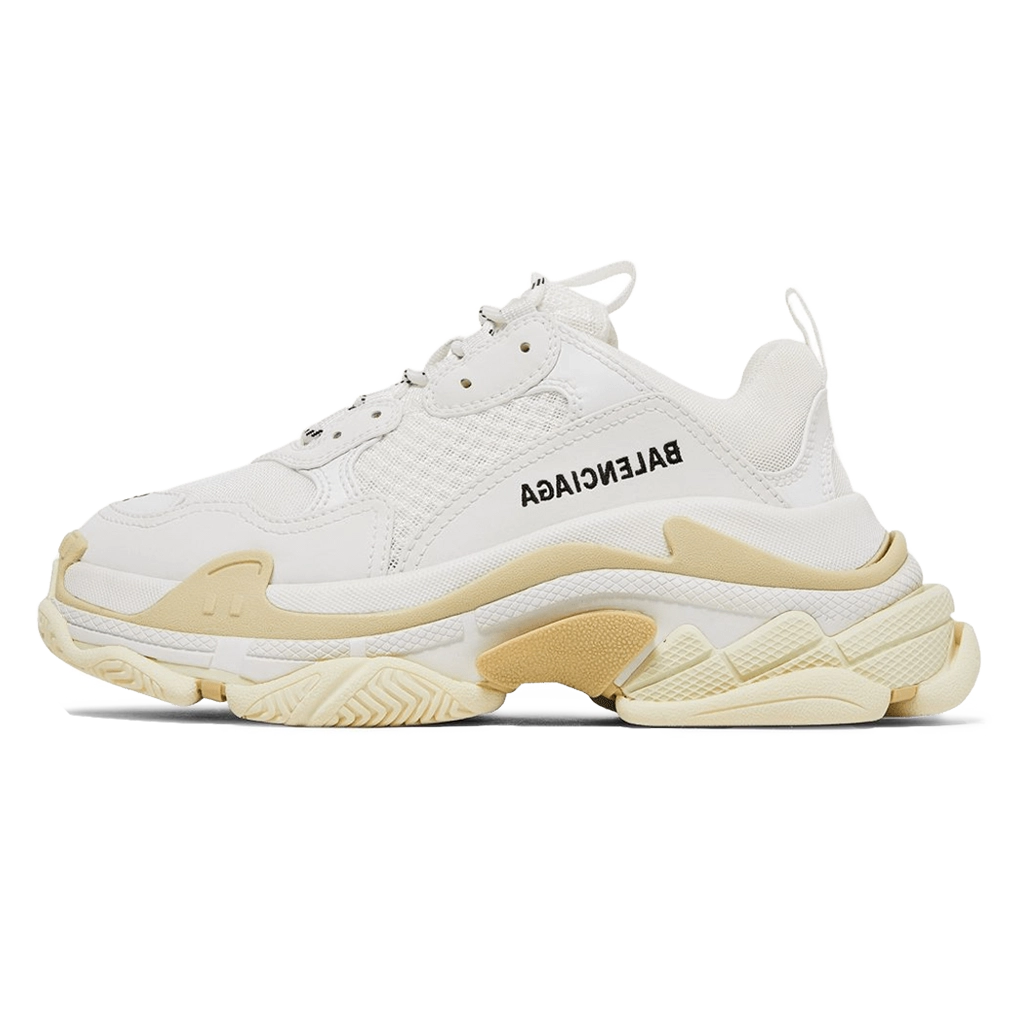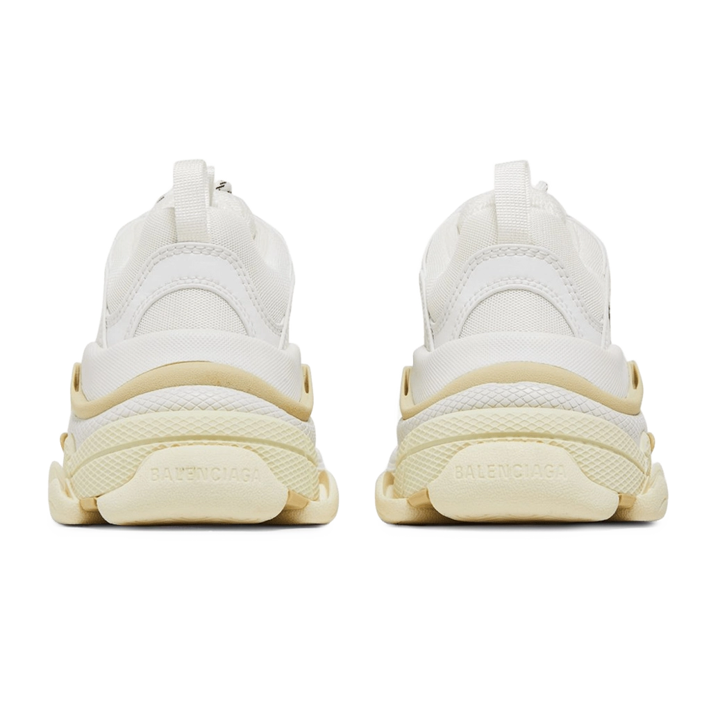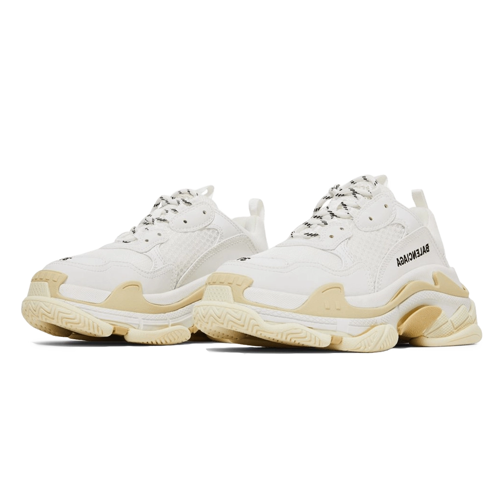 Balenciaga Triple S White משלב את סילואט הסניקרס העבה האייקוני של המותג עם מראה לבן נקי. עשויה מעור איכותי, רשת וזמש, לנוחות, עמידות ומראה יוקרתי. הסוליה המשולשת המוגדלת מספקת ריפוד וגובה בולט, מה שהופך את הנעל לפריט רב-שימושי בארון אופנת רחוב מודרני.