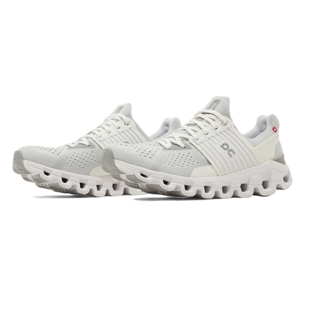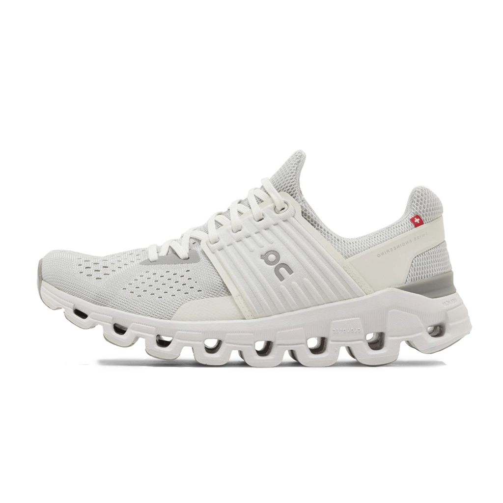 נעלי On Running Cloudswift בצבע אפור קרח ולבן מספקות נוחות קלה ונשימה עם תמיכה עמידה. מושלמות לרצים יוניסקס המחפשים ביצועים וסגנון.