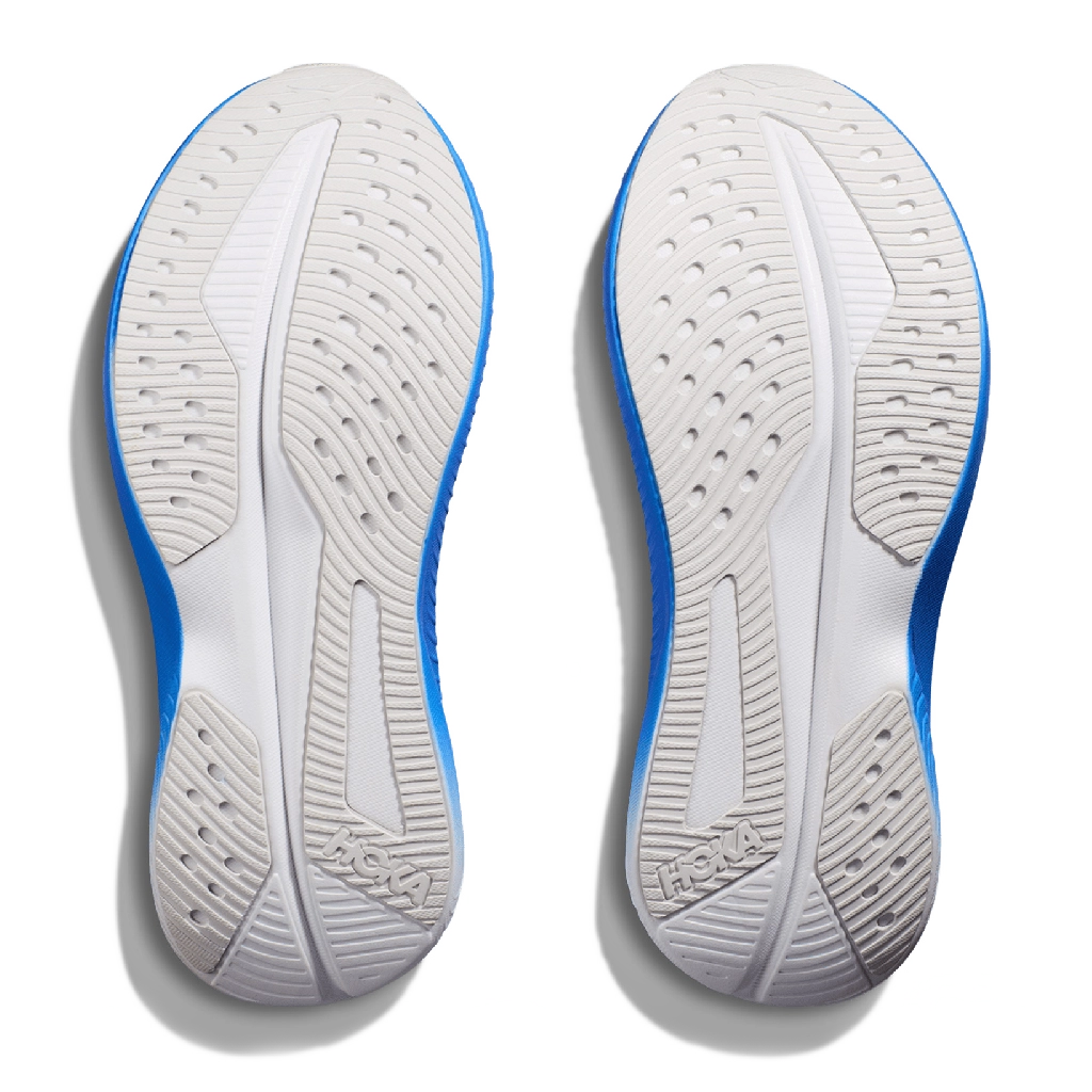נעלי HOKA Mach 6 בצבע White Virtual Blue מעניקות ריפוד רספונסיבי וביצועים קלים לריצות מהירות.