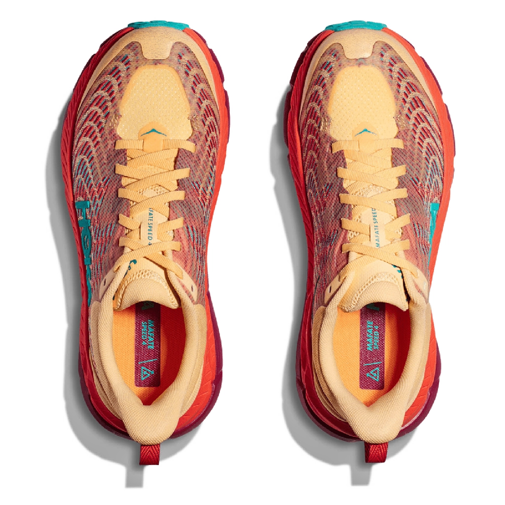 נעלי HOKA Mafate Speed 4 “Impala Flame” משלבות ביצועי שטח מצוינים עם צבע בוהק ואשוני שיבלוט בכל מסלול. כוללות עליונית רשת לנשימה, סוליית ביניים CMEVA לריכוך ותמיכה, וסוליית Vibram® Megagrip לאחיזה ויציבות במסלולי שטח מאתגרים. צבע Impala Flame הבוהק מעניק אנרגיה וסגנון לכל צעד, מה שהופך אותן לבחירה אידיאלית לחובבי שטח.