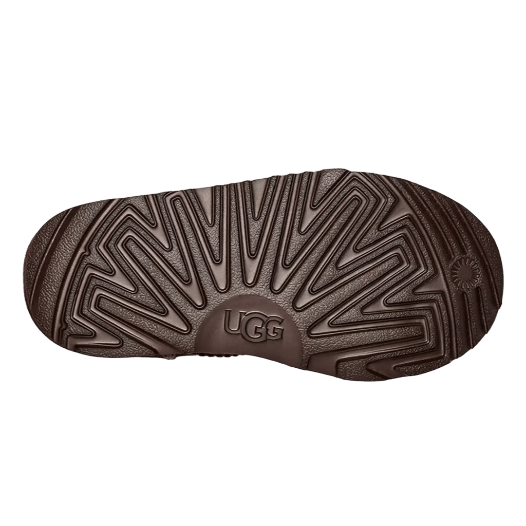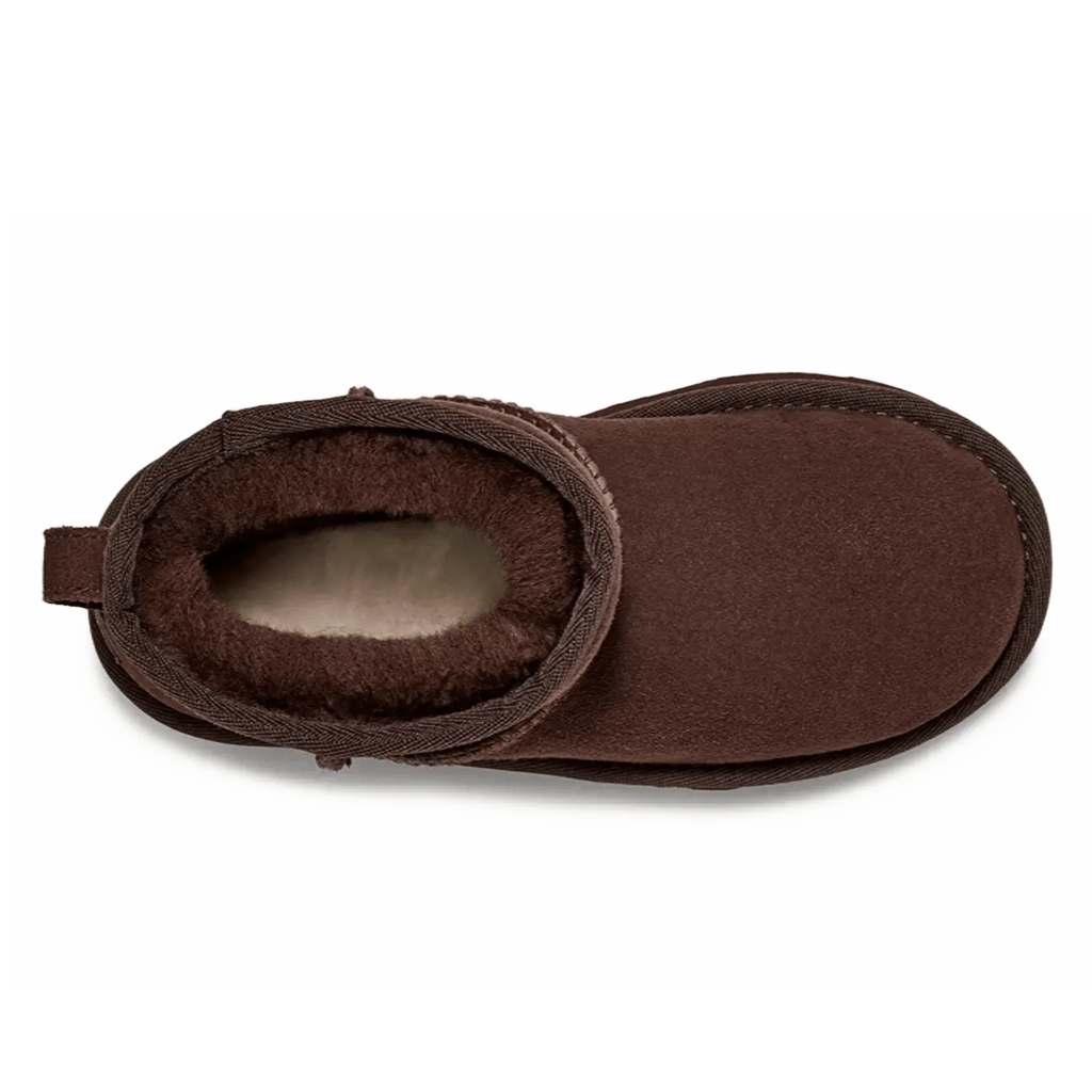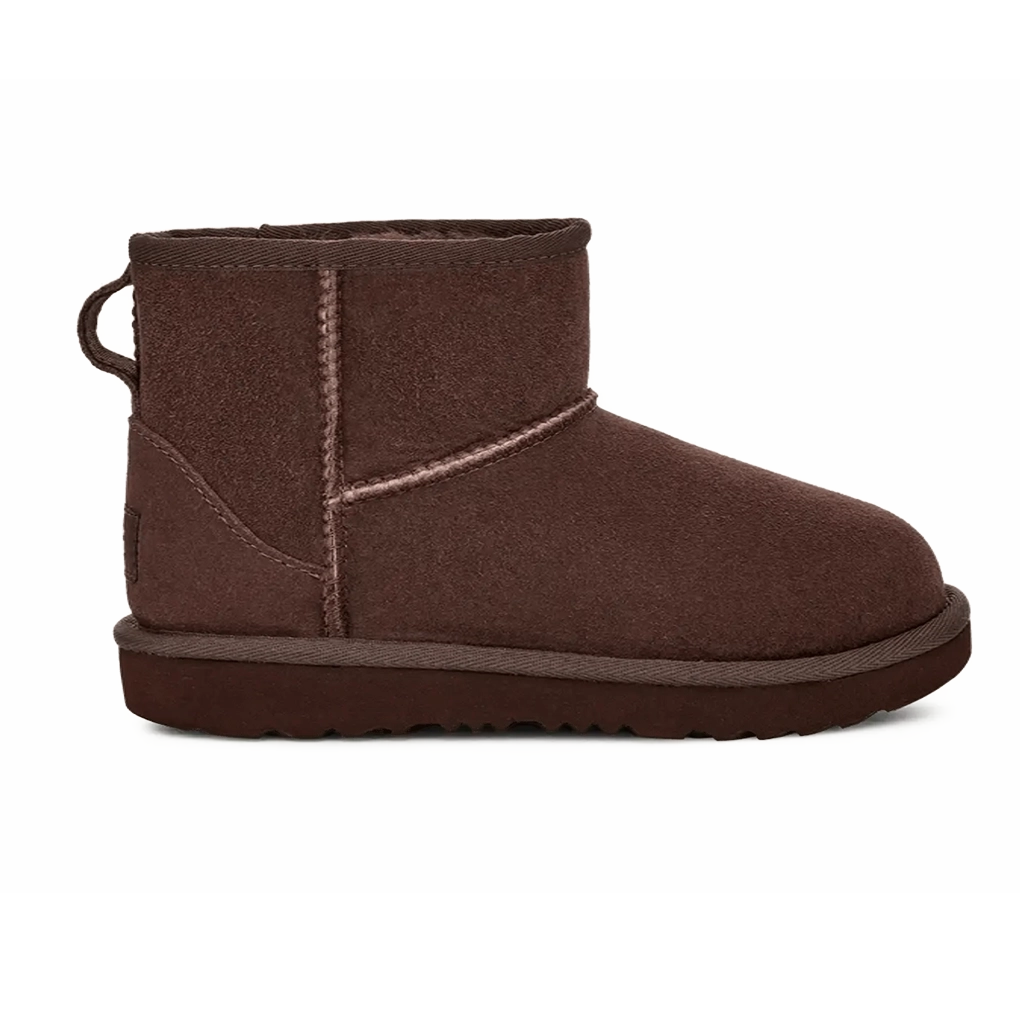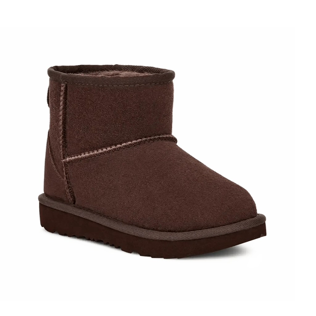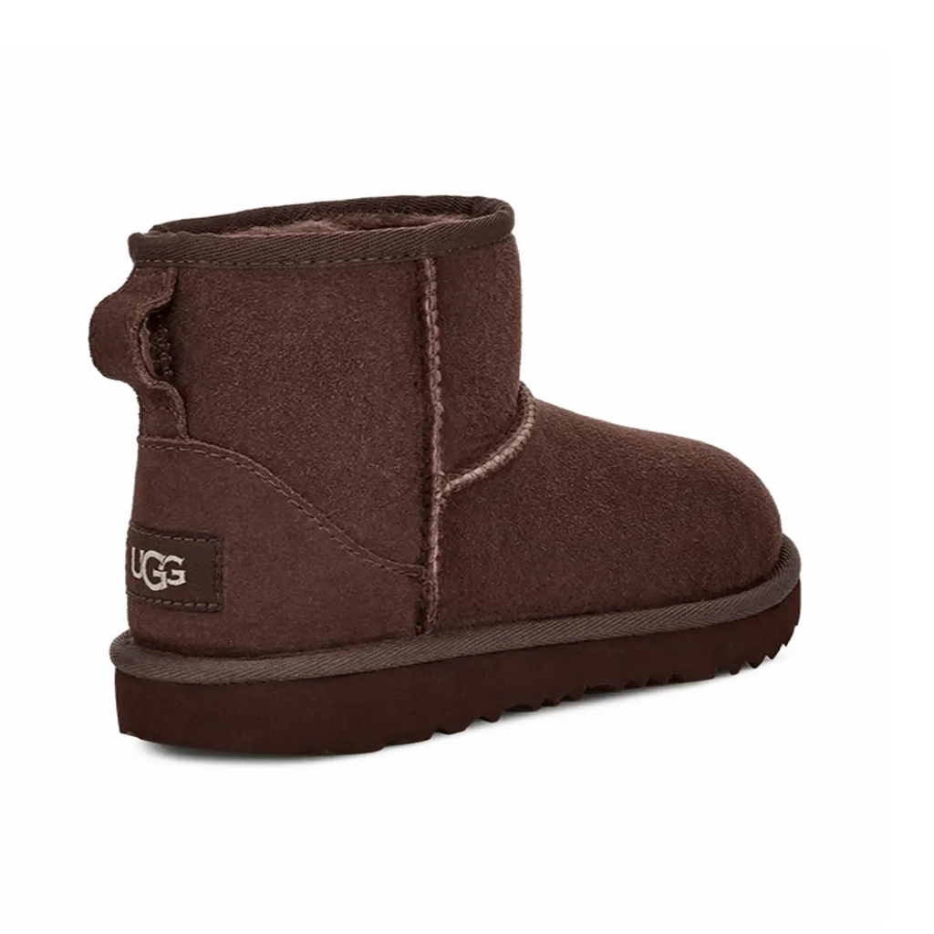 מגפי Kids’ Mini Classic II Burnt Cedar משלבים זמש רך, ריפוד צמר כבשים והגנה דוחת מים. פריט UGG חמים בגוון טבעי ועמוק.