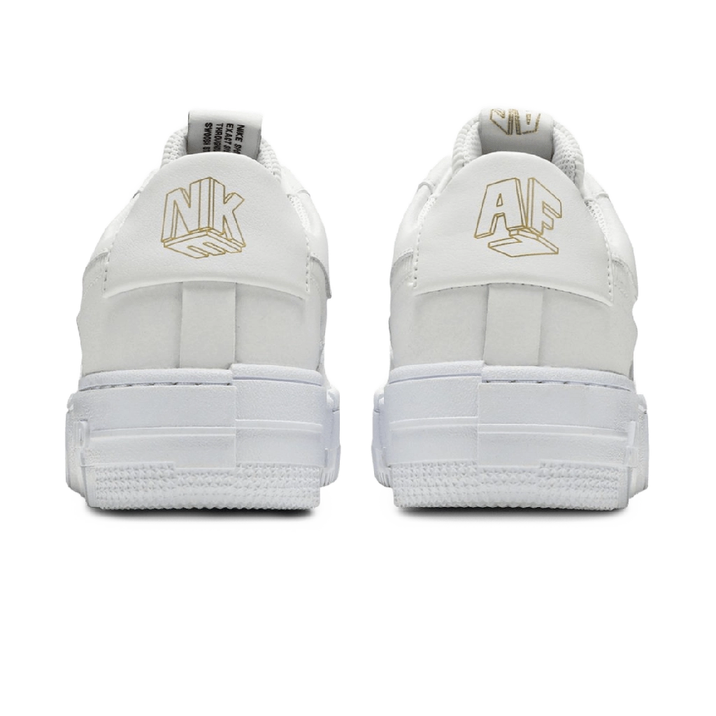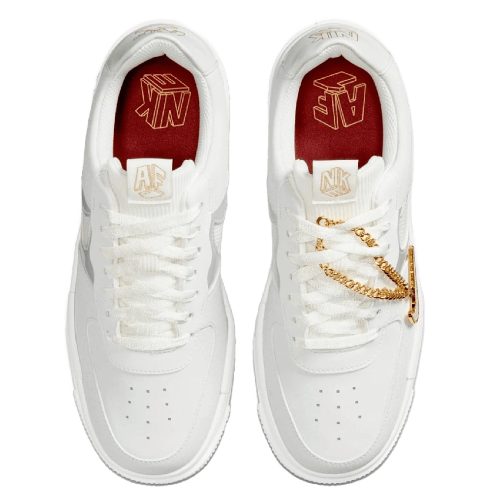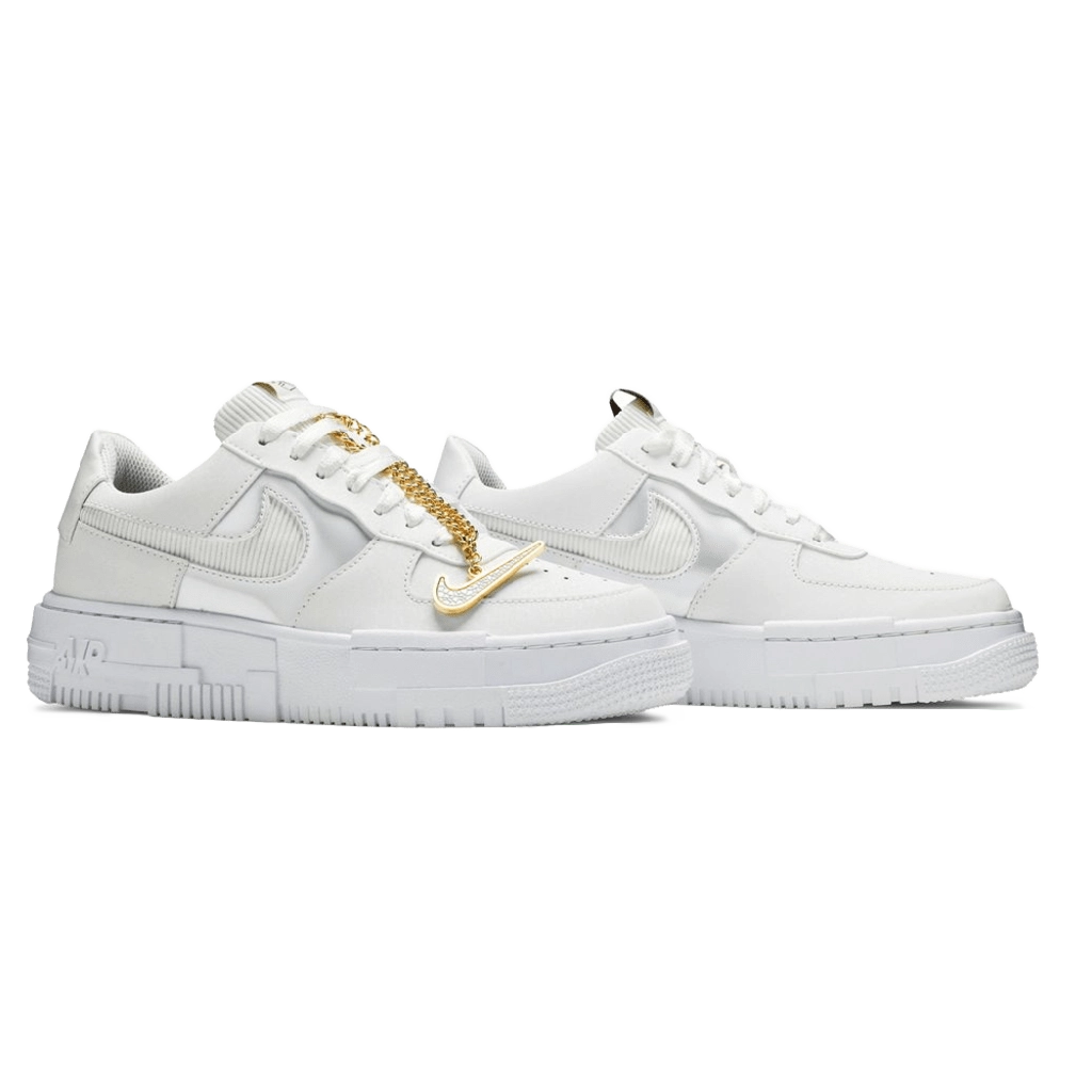 שרשרת Nike Air Force 1 Pixel Gold כוללת חלק עליון מעור לבן עם תוספות סאטן וקורדרוי בגוונים שונים של לבן ואפור בהיר. שרשרת הזהב והקסם של Swoosh מושחלים דרך השרוכים של הנעל.