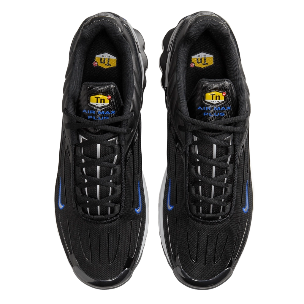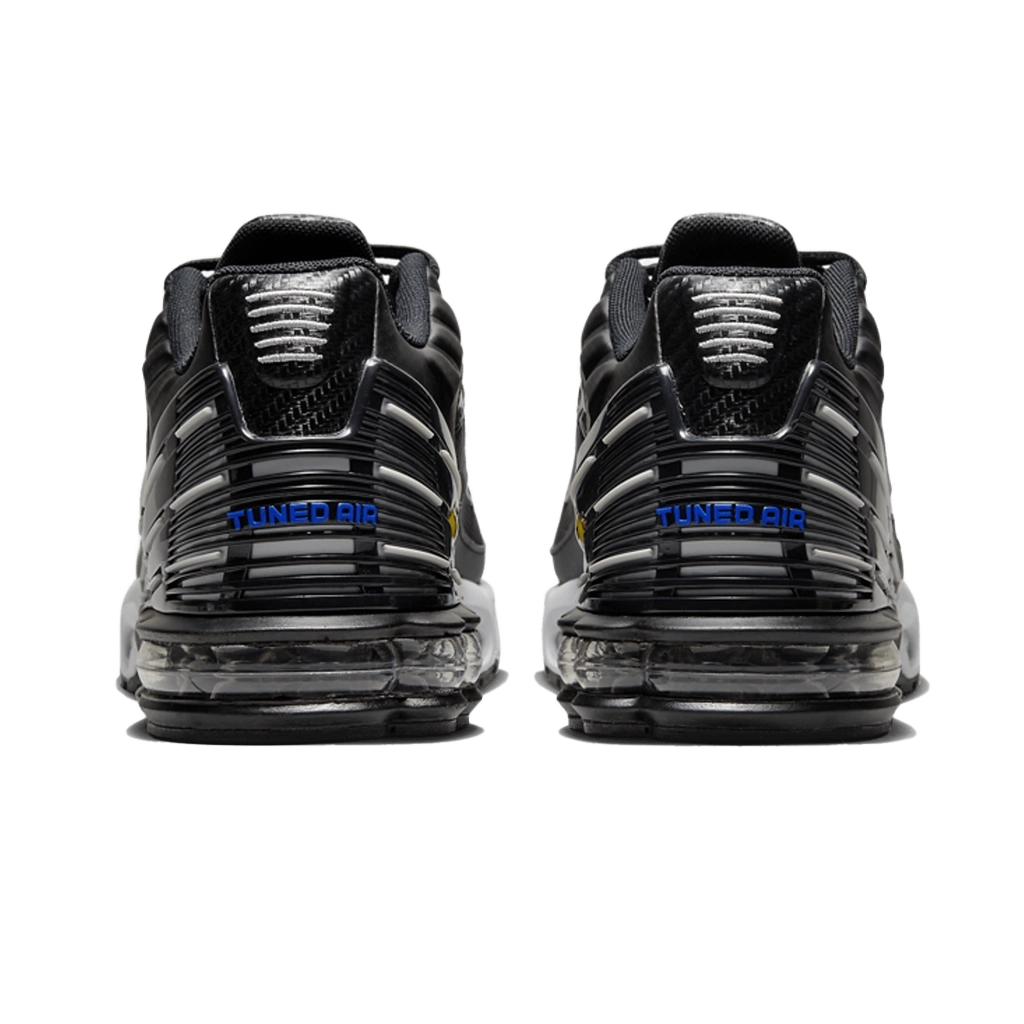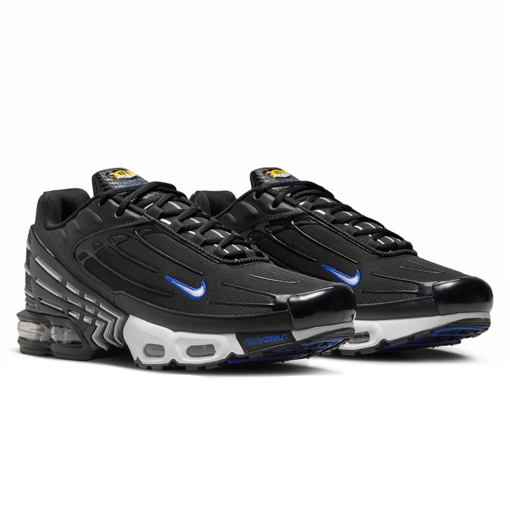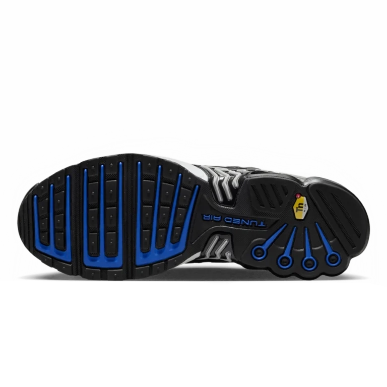 נעלי נייקי אייר מקס פלוס 3 “רייסר בלו סילבר” משלבות עיצוב עתידני עם נוכחות ספורטיבית בולטת. הגפה השחורה מעניקה מראה חלקלק ומוקפד, עם נגיעות כחול רייסר וכסף מטאלי המדגישות את המבנה הדינמי. טכנולוגיית Tuned Air המובנית בעקב ובקדמת הרגל מציעה רכות יציבה ונוחות לאורך כל היום. כל פרט, מהגימור הגרדיוני ועד ליחידת העקב המפוסלת, נועד להרשים.