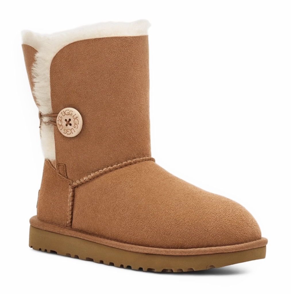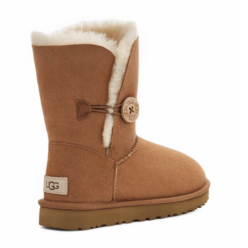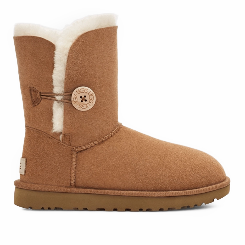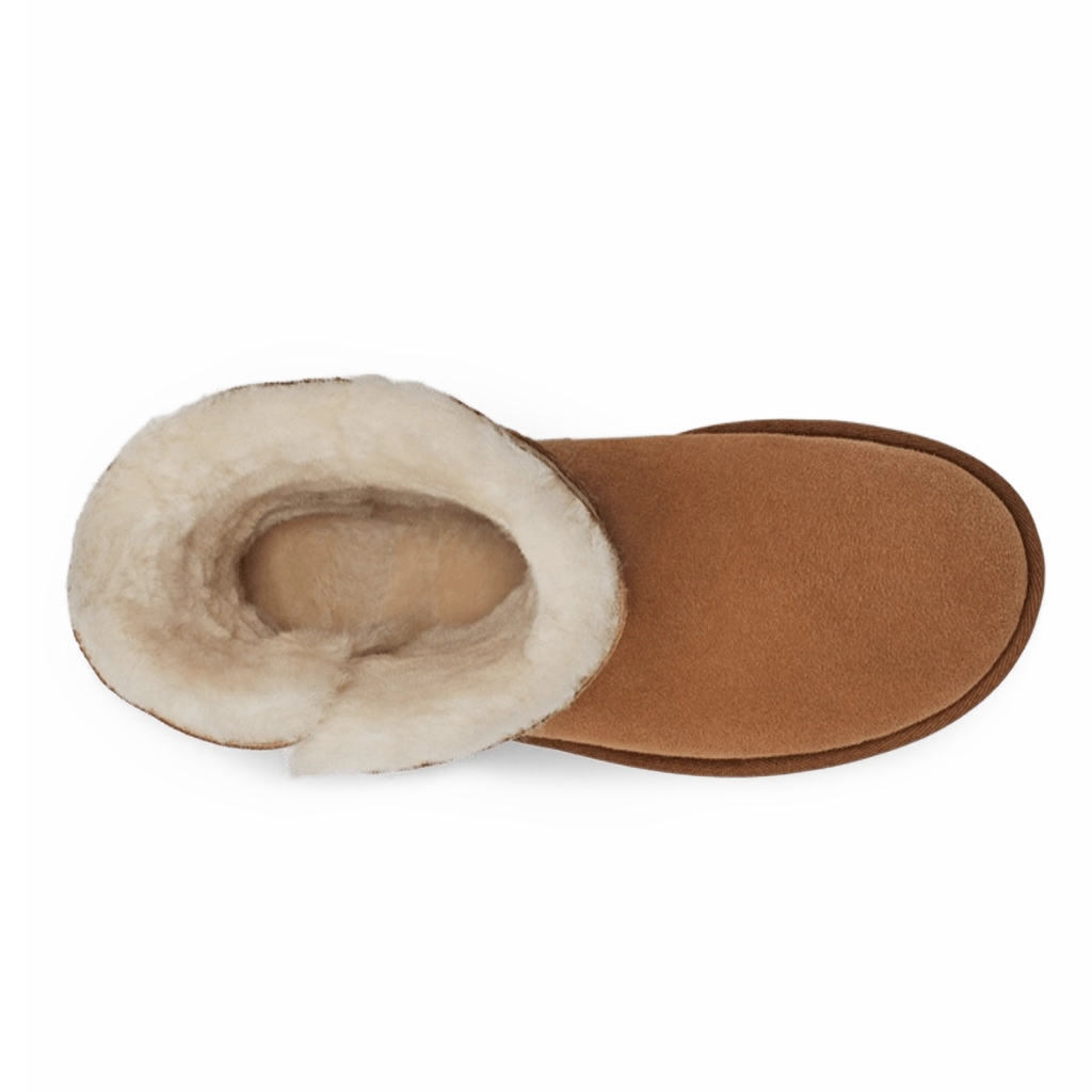 ה-UGG Bailey Button II בצבע צ’סטנאט מציע פרשנות מחודשת לצללית הקלאסית, עם כפתור עץ אלגנטי ולולאת גומי לסגירה נוחה. עשוי מזמש רך ועמיד במים עם בטנת צמר כבשים יוקרתית, המגף מעניק נוחות, חמימות ועמידות. העיצוב בגובה אמצע השוק מאפשר לנעול אותו סגור או מקופל, ומתאים לכל סגנון.