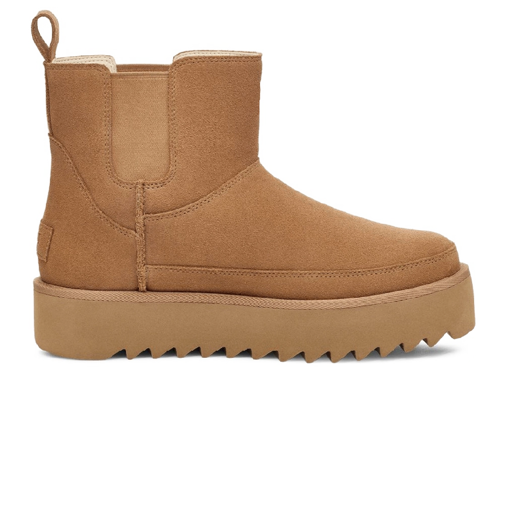מגף UGG Classic Chelsea Platform Mini בצבע חום ערמוני משלב חמימות ונוחות עם עיצוב עדכני ונועז. עשוי מזמש רך ובטנת כבשים טבעית עם סוליית פלטפורמה מוגבהת.