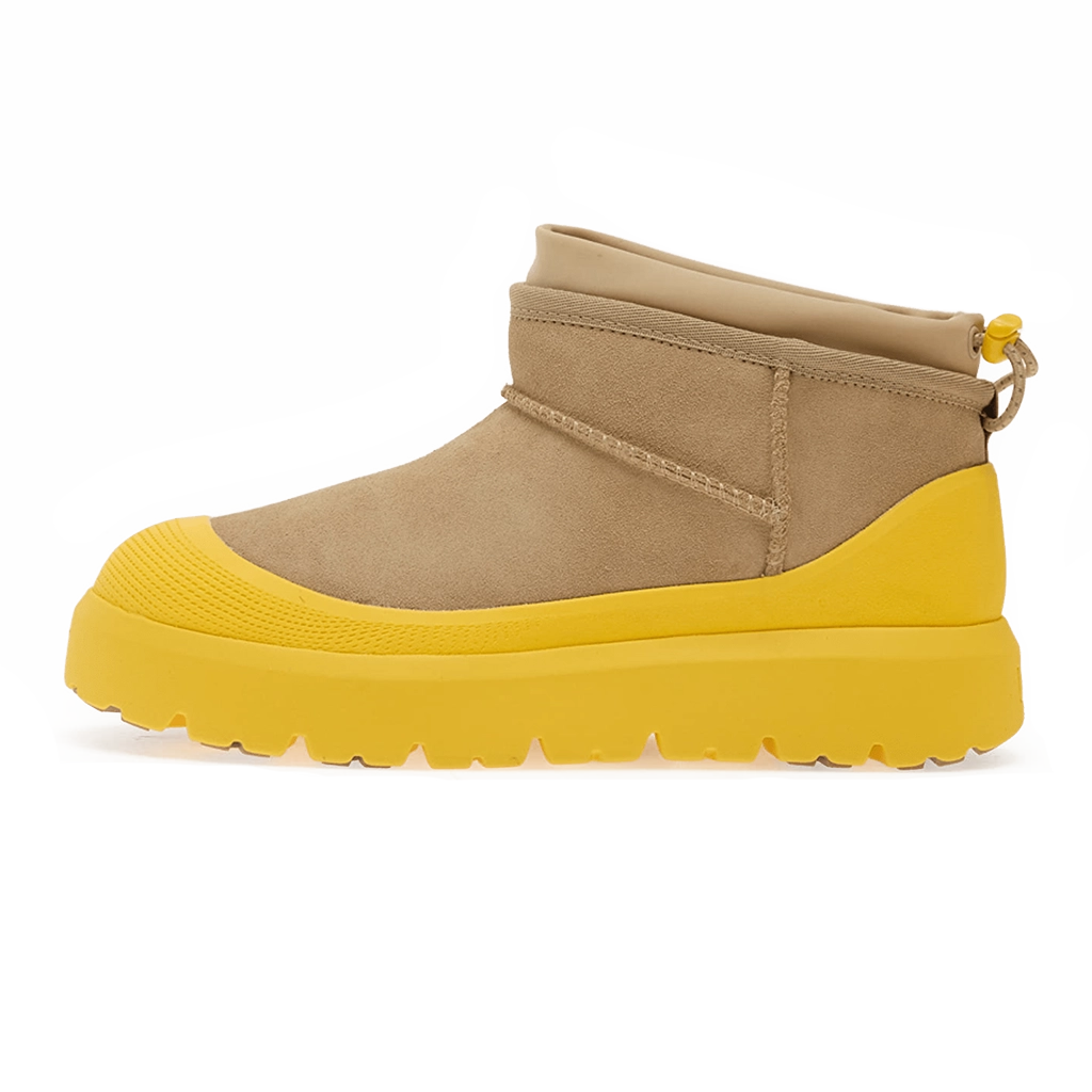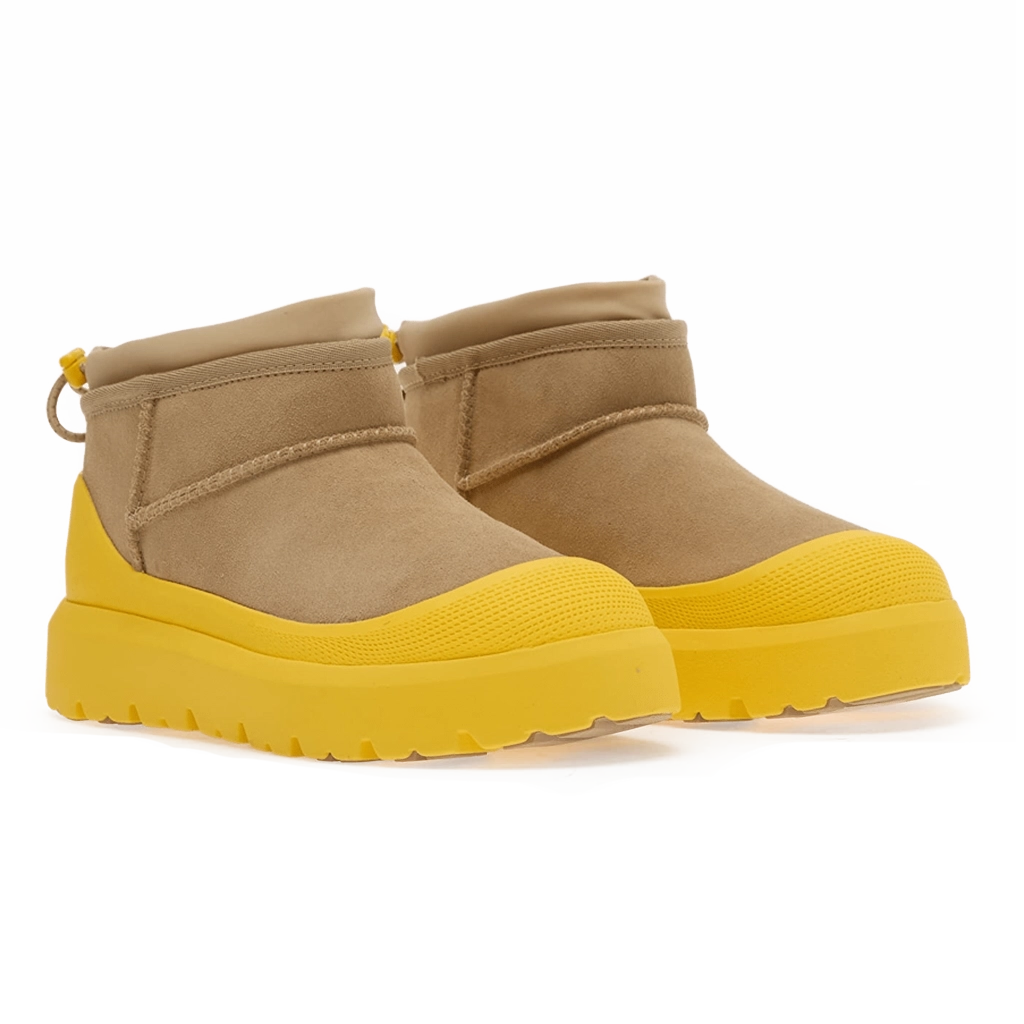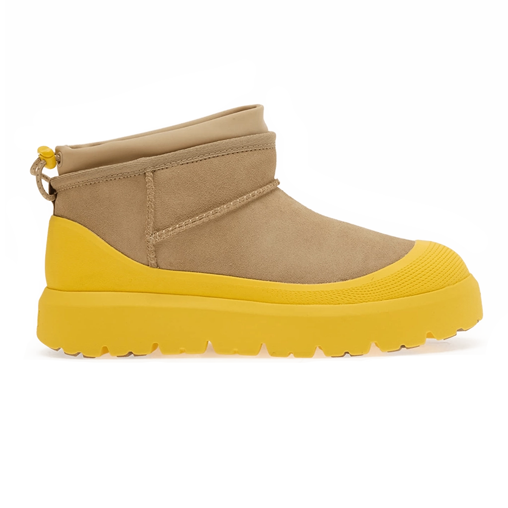 ה-UGG Classic Ultra Mini Weather Hybrid Boot בצבע Mustard Seed / Summer Wheat מציע עיצוב אייקוני עם הגנה משופרת מפני מזג האוויר. עשוי זמש עמיד למים וריפוד צמר רך, הוא שומר על חום, יובש וסטייל בכל תנאי. הגזרה הנמוכה מעניקה מראה מודרני ושימושי, בעוד שהסוליה הקלה והעמידה מבטיחה נוחות לאורך כל היום ואחיזה יציבה. אידיאלי למעברי עונות ולמראה יומיומי עדכני.