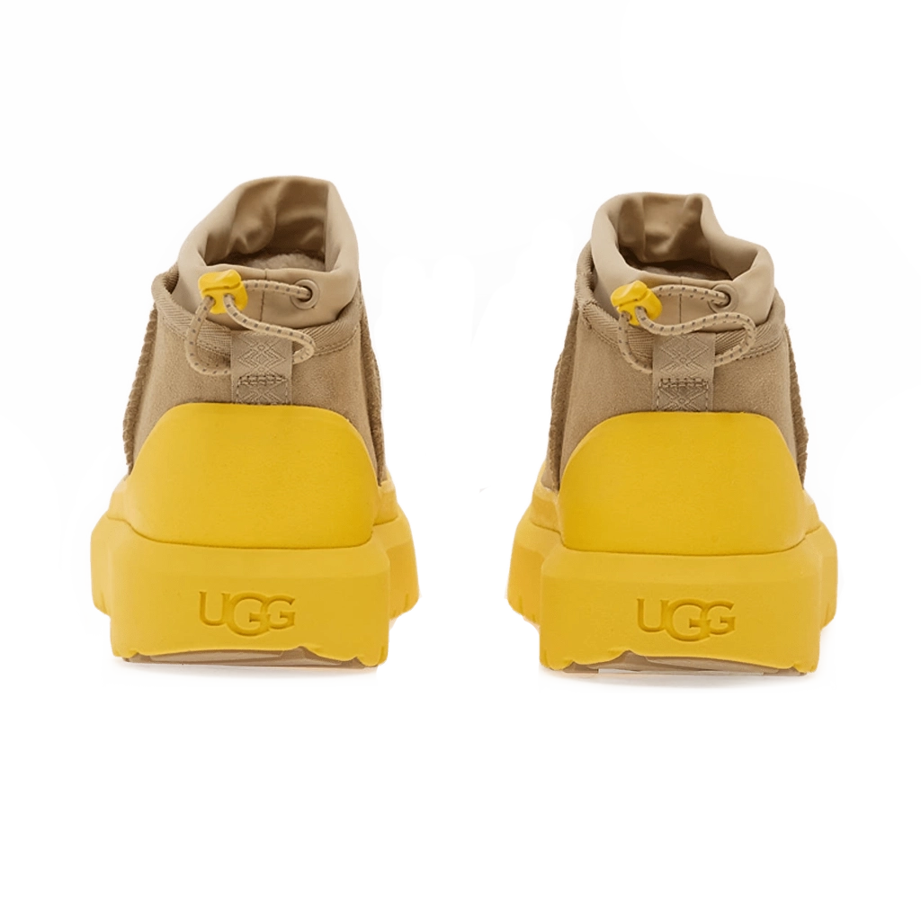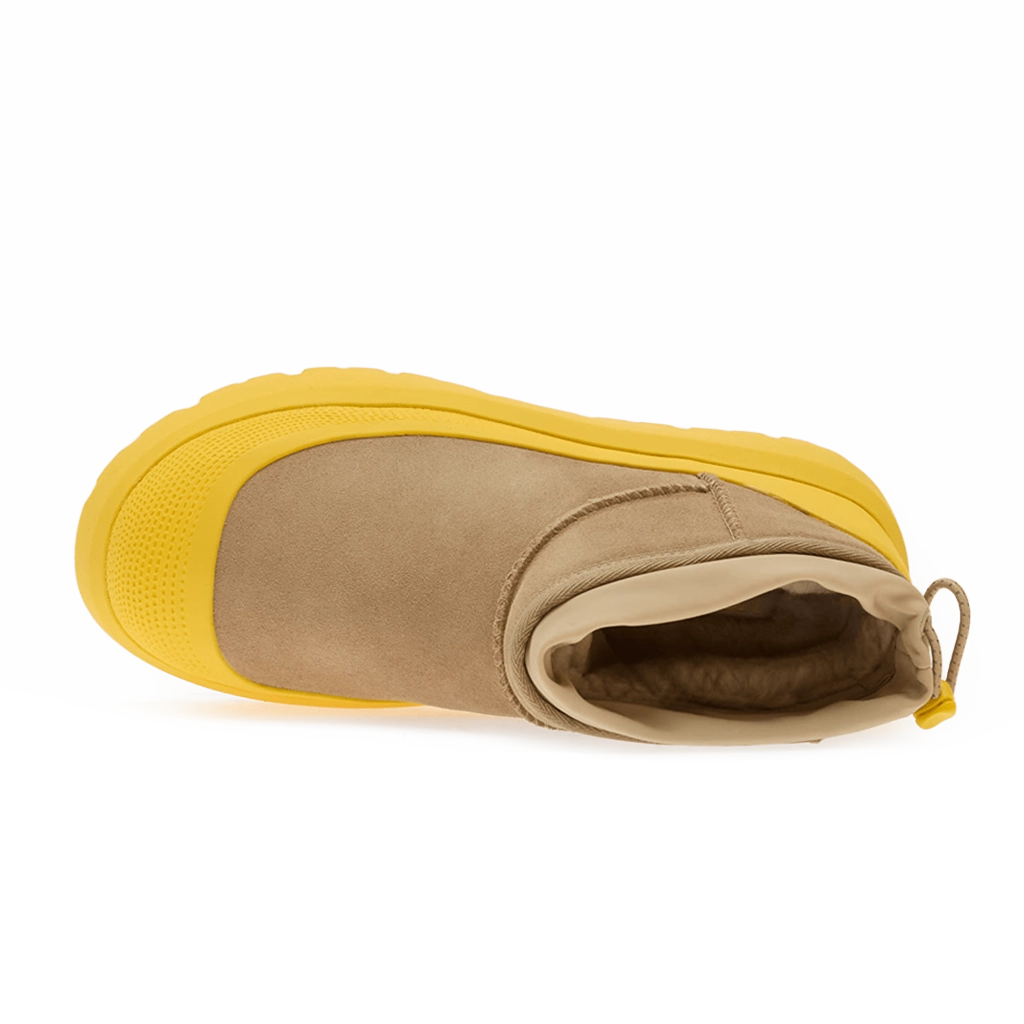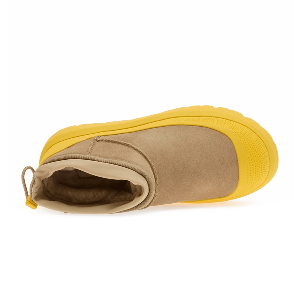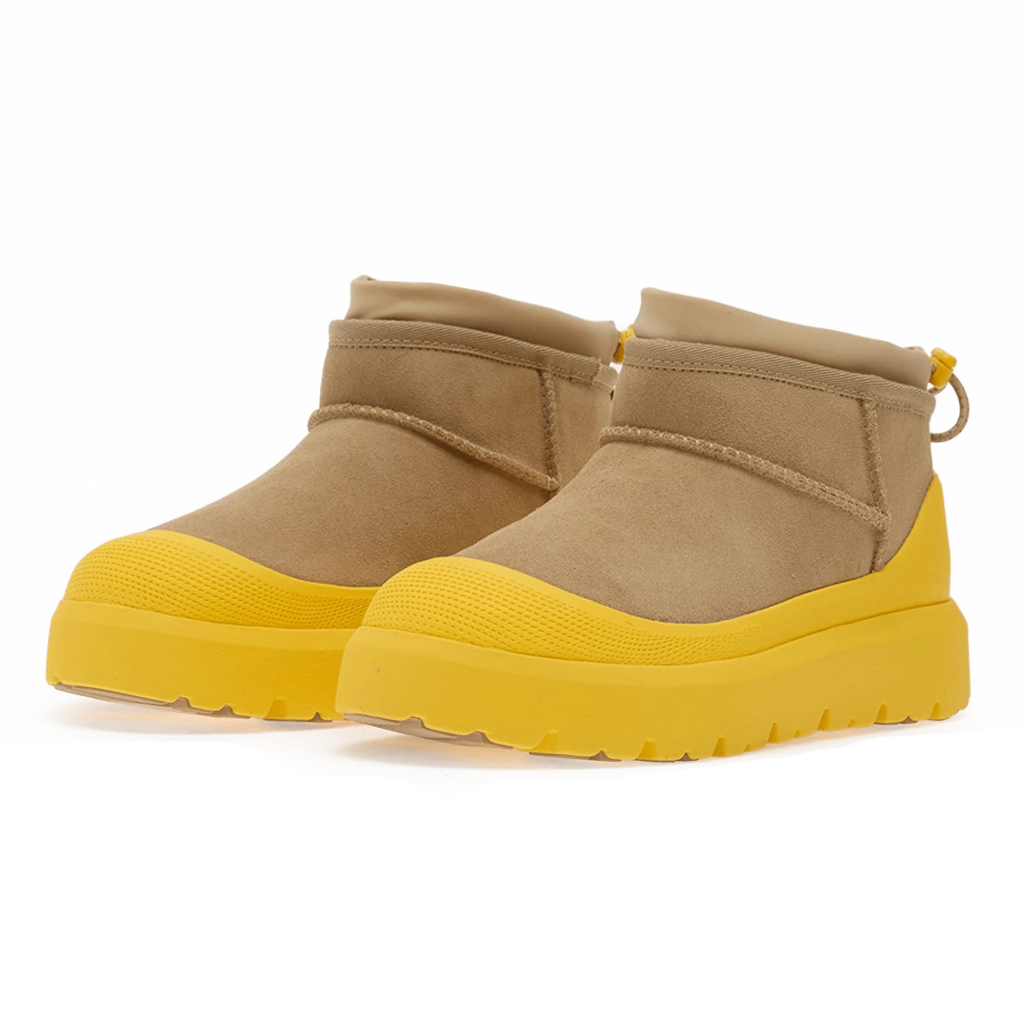 ה-UGG Classic Ultra Mini Weather Hybrid Boot בצבע Mustard Seed / Summer Wheat מציע עיצוב אייקוני עם הגנה משופרת מפני מזג האוויר. עשוי זמש עמיד למים וריפוד צמר רך, הוא שומר על חום, יובש וסטייל בכל תנאי. הגזרה הנמוכה מעניקה מראה מודרני ושימושי, בעוד שהסוליה הקלה והעמידה מבטיחה נוחות לאורך כל היום ואחיזה יציבה. אידיאלי למעברי עונות ולמראה יומיומי עדכני.