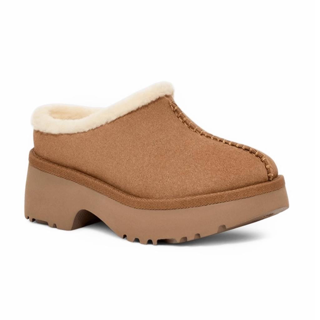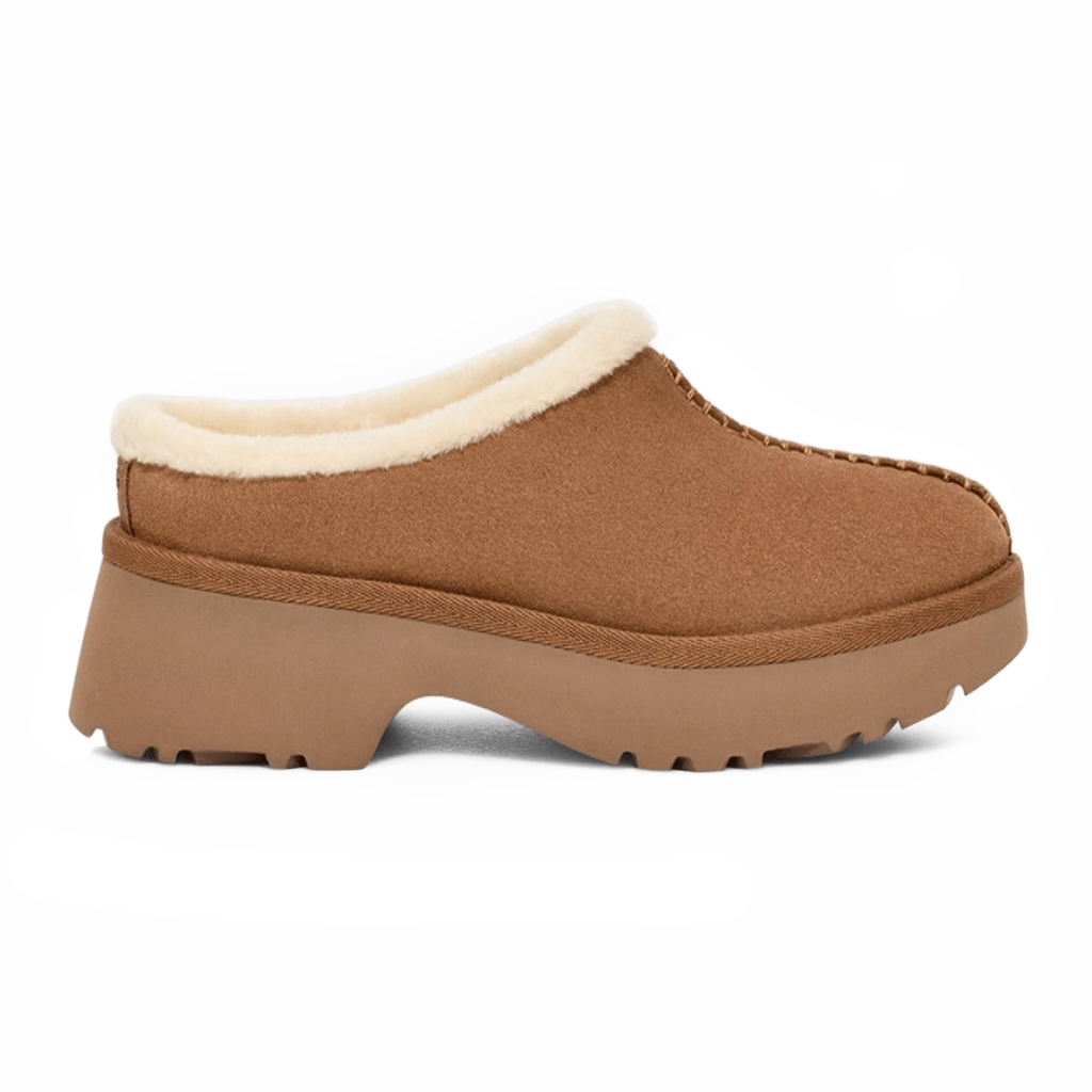 UGG New Heights Cozy Clogs בצבע Chestnut משלבים נוחות מפנקת עם עיצוב פלטפורמה אלגנטי. מושלם לשימוש יומיומי או מנוחה בבית.